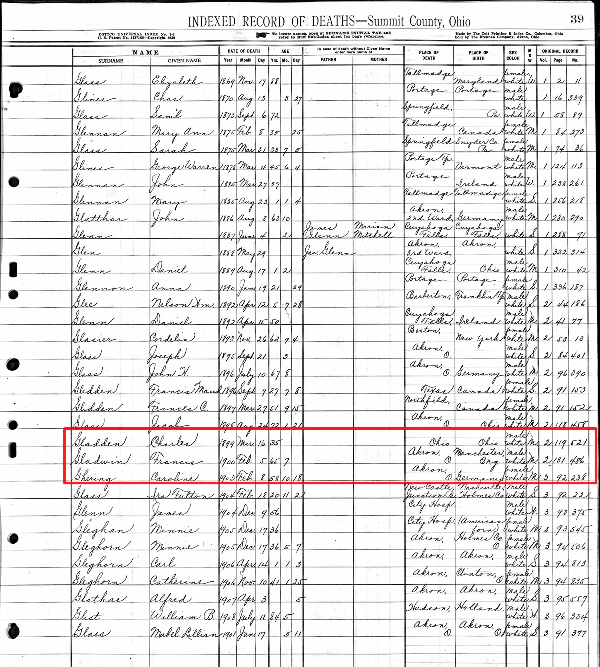 Death Record of Francis Gladwin