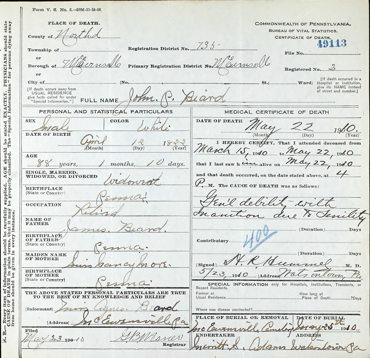 Death Record of John P. Beard