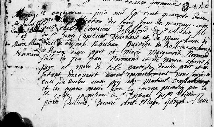 Marriage Record of Marie-Marguerite Normand and Louis-Charles DelLeBlond dit Staint-Aubin Part 1