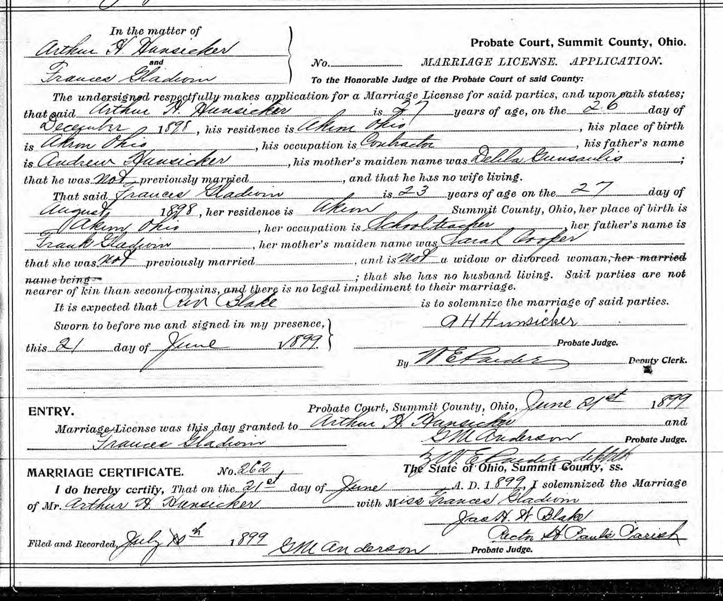 Marriage Record of Frances Gladwin and Arthur Hunsicker