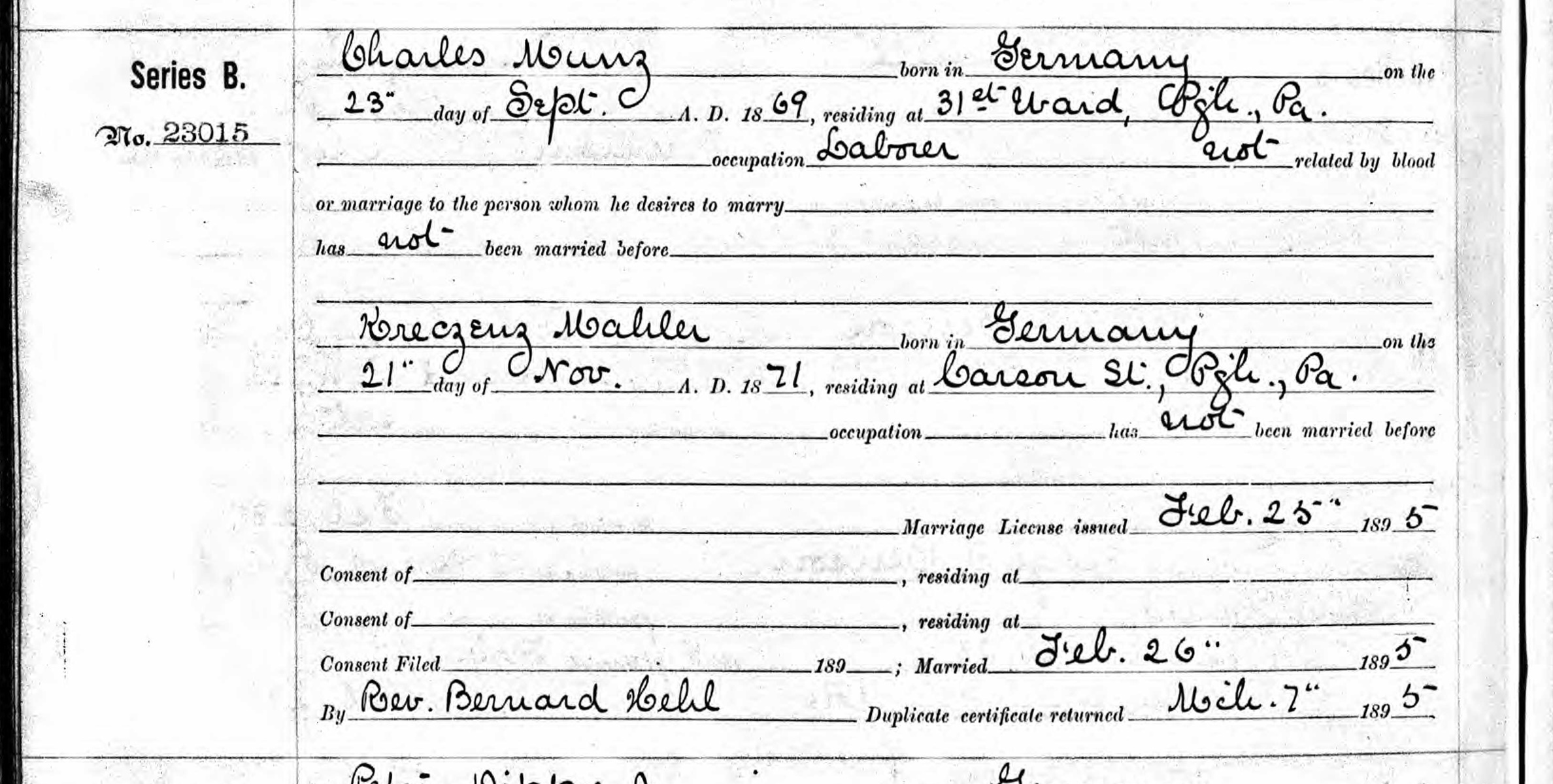 Marriage Record of Kreczenz Mahler and Charles Munz
