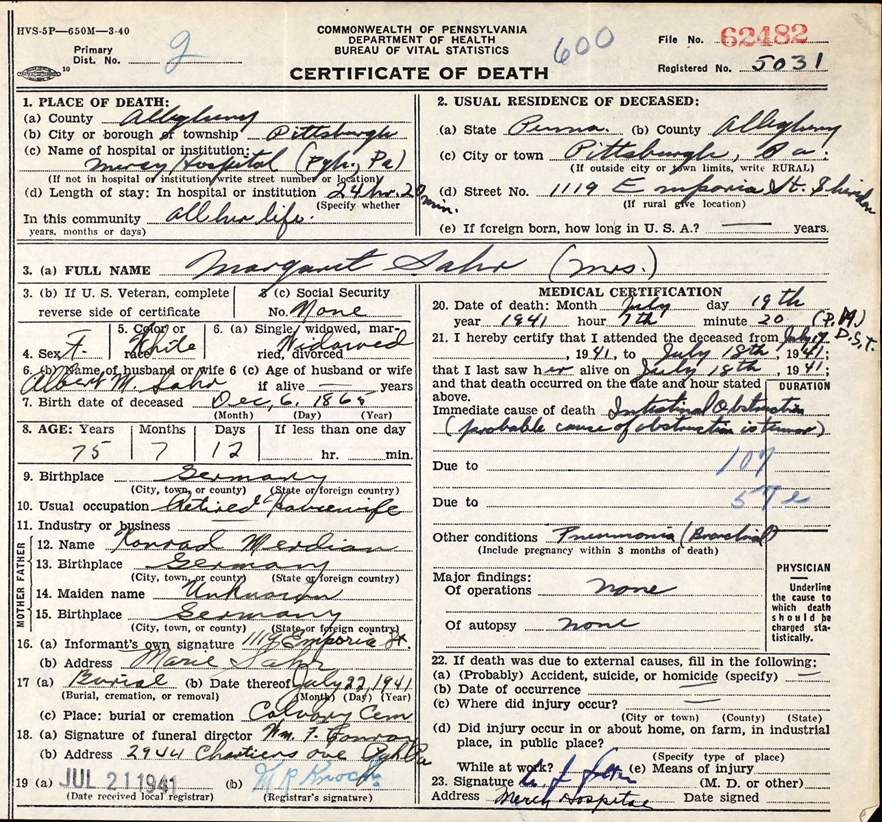 Death Certificate of Margaret Sahr