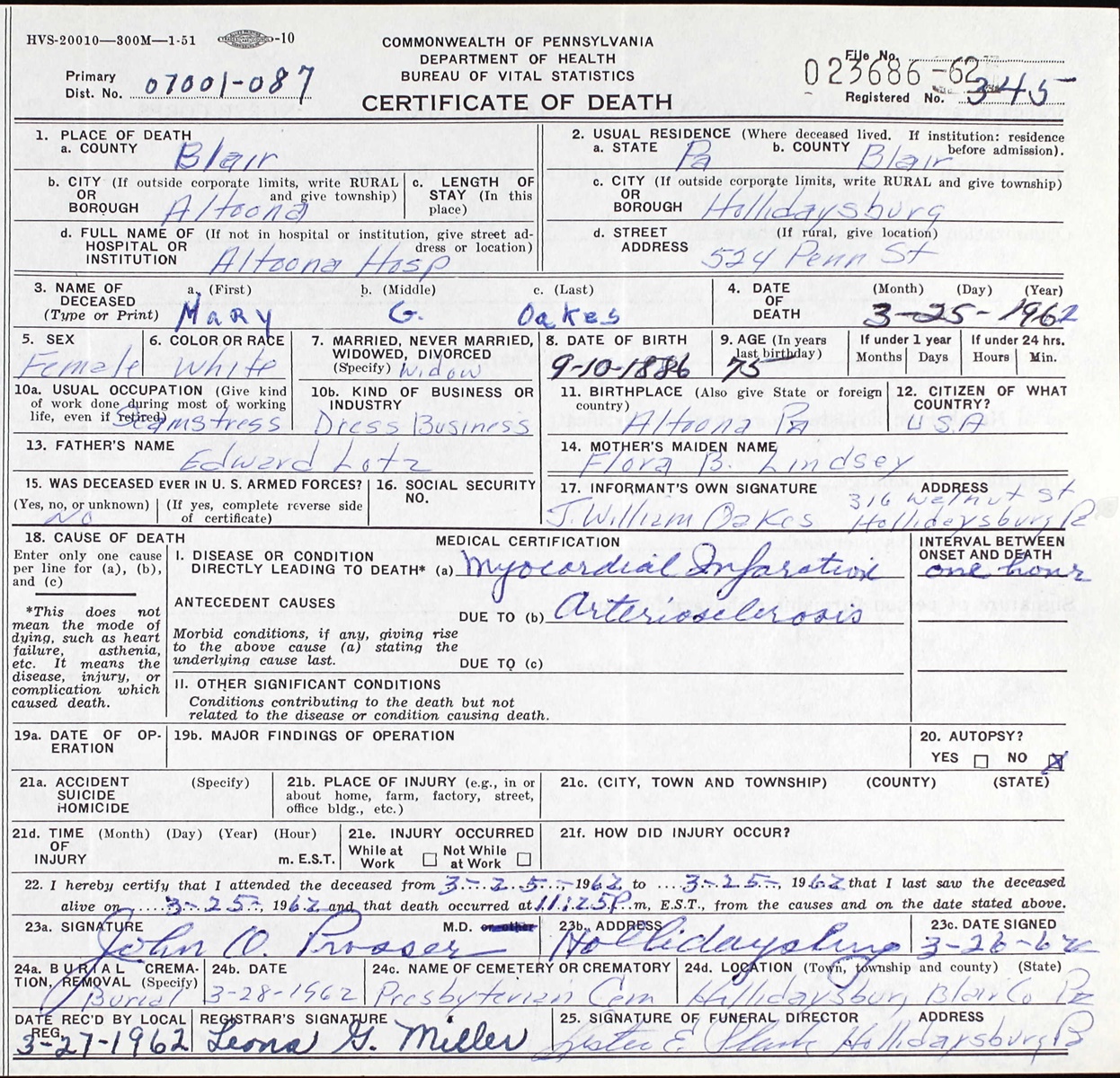 Certificate of Death for Mary G. Oakes