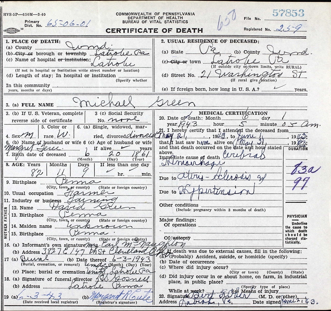 Certificate of Death of Michael Green