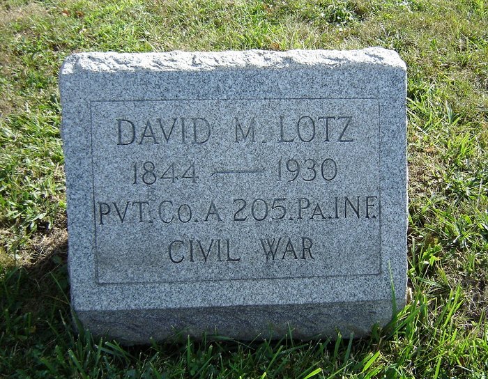 David Milton Lotz died on 1 February 1930 at Altoona, Blair County, Pennsylvania, at age 85. He was buried on 4 February 1930 at Carson Valley Cemetery, Duncansville, Blair County, Pennsylvania, in plot D-5, Koon section.