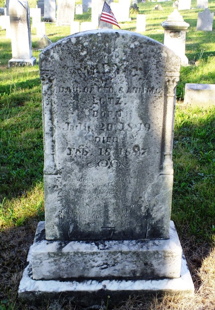 Mary C. Lotz was born on 20 July 1849 at Pennsylvania. She was the daughter of George Lotz and Catherine Ann Fleck. Mary C. Lotzappeared on the US Census of 1850 in the household of George Lotz and Catherine Ann Fleck at Tyrone Township, Blair County, Pennsylvania.1 Mary C. Lotzappeared on the US Census of 1860 in the household of George Lotz and Catherine Ann Fleck at Tyrone Township, Blair County, Pennsylvania.2 Mary C. Lotzappeared on the US Census of 1870 in the household of George Lotz and Catherine Ann Fleck at Logan Township, Blair County, Pennsylvania.3 Mary C. Lotzappeared on the US Census of 1880 in the household of George Lotz and Catherine Ann Fleck at Logan Township, Blair County, Pennsylvania.4 Mary C. Lotz died on 18 February 1887 at Pennsylvania at age 37. She was buried at Saint Johns Lutheran Cemetery, Tyrone Township, Blair County, Pennsylvania.