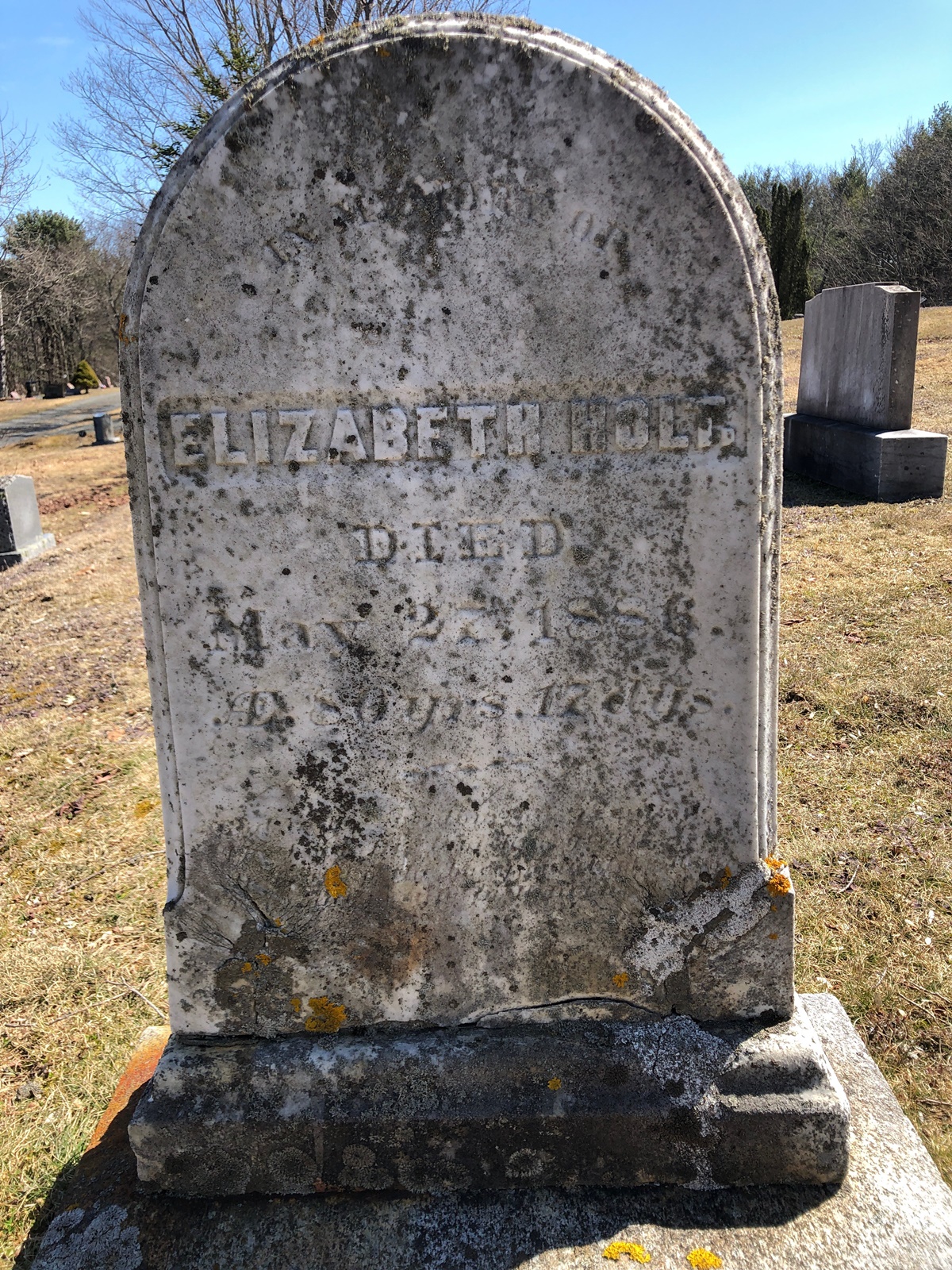 Elizabeth, age 43 years, and Solomon, age 48 years, appeared on the US Census of 1850 at Hermon, Maine.1 Elizabeth, age 43 years, and Solomon, age 48 years, appeared on the US Census of 1850 at Hermon, Maine.1 Elizabeth Harlowappeared on the US Census of 1870 in the household of Lorenzo Fred Lord and Augusta Ann Holt at Hermon, Maine.5 Elizabeth Harlowappeared on the US Census of 1870 in the household of William B. Hardy and Laura Frances Holt at Hermon, Maine.5 Elizabeth Harlowappeared on the US Census of 1880 in the household of Philip H. Nowell and Catherine Holt at Hermon, Maine.6 According to the Federal Census in 1880, Elizabeth was a widow living with her daughter.6 She died on 27 May 1886 at Hermon, Maine, at age 80.2 She was buried at Snows Corner Cemetery, Hermon, Maine.2,7