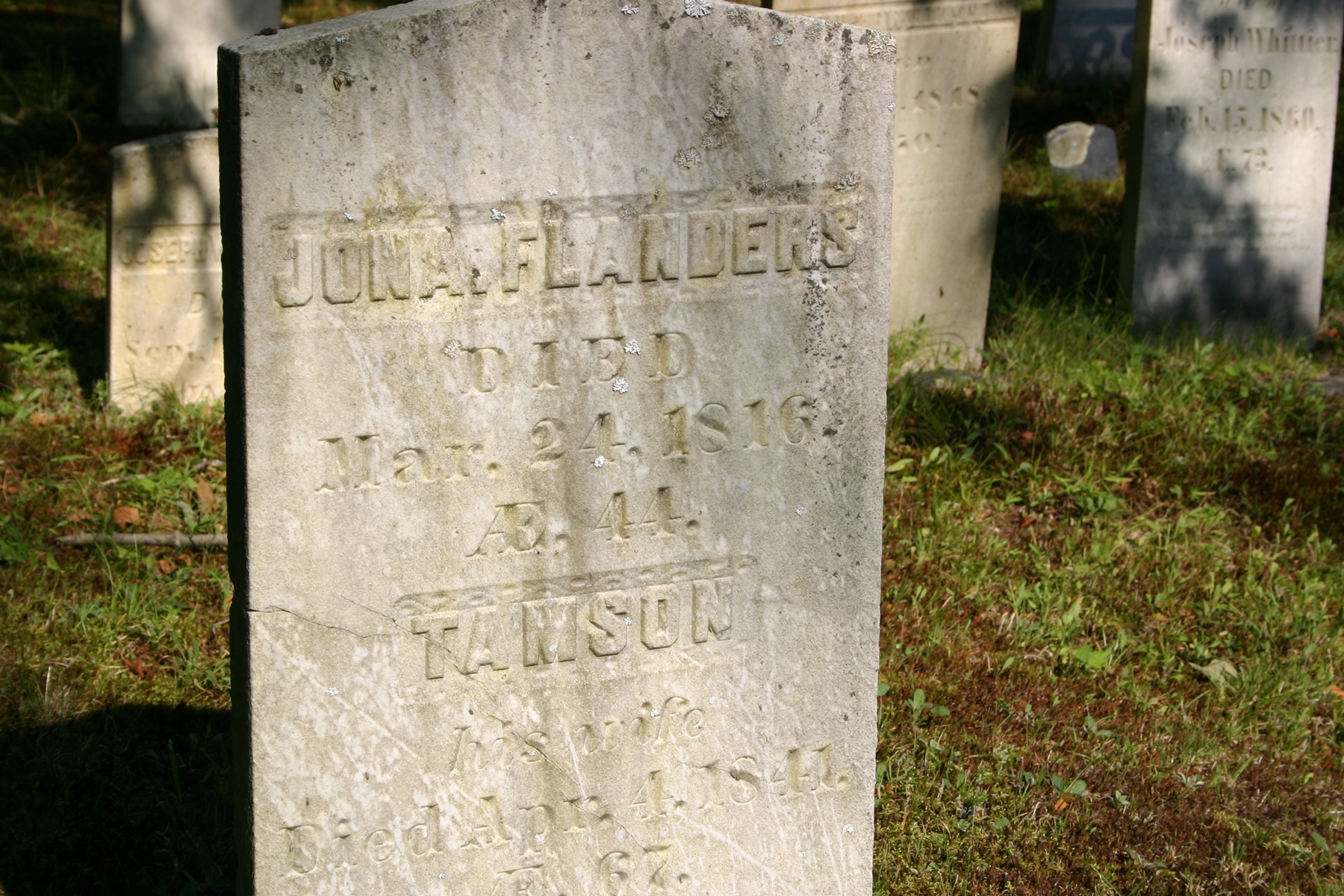 Jonathan Flanders married Tamzin Whittier, daughter of Nathaniel Whittier and Anna Carlton, at Salisbury, Massachusetts.