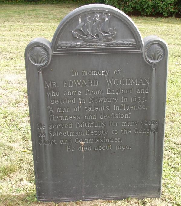 Lt. Edward Woodman married Joanna Salway, daughter of Aurthur Salway and Mary Searle, circa 1628 at England.1,2,3,9,10,11 Edward and Joanna immigrated circa 1635 to Massachusetts.1 He was elecxted a Selectman in 1635. This was Newbury's first board of Selectman, then called "the seven men." He served again in 1638.1,2,3,9,12 He was usually styled "Mr." indicating a good position in the community. Only fifteen of the original 91 grantees of Newbury were entitled to be called "Mr."1,3,9,13 Lt. Edward Woodman was admitted as a freeman on 25 May 1636 at Newbury, Massachusetts.1,2,3,14,15 He was appointed the Representative to the Massachusetts General Court from Newbury. He served again in 1636, 1637, 1639, 1643, 1659, 1660, 1664, and 1670.1,2,3,9,12 On 17 May 1637, he was promoted to Lieutenant in the Newbury Militia Company., The date wasrecorded as 12 (1) 1637/1638.1,3,12 He was the Commissioner to End Small Causes. He held this office again in 1638, 1641, and 1650.1,2,3,9,12 On 12 March 1637/38, he was licensed to sell strong drink in Newbury. The date was recorded as 17 (3) 1637.1,14 He applied to aid the magistrates in execution of court decrees on 6 September 1638.14 In 1647, he was the Town Moderator.1,2,3,9,12 In 1652, he was a member of the School Committee.1,2,3,9,12 He was Edward was the leader of the opposition to the Rev. Thomas Parker's attempt to change the church government from Congregationalism to something akin to Presbyterianism.3,13,12 He was commissioned by the state to see people marry. In 1681 he wrote: "An unprofitable commission; I quickly laid aside the worke, which has cost me many a bottle of sacke and liquor, where friends and acquaintances have been concerned." It may be noted that in that period in Massachusetts, people were not married by ministers in the church.13,9 Edward and Joanna joined the Church in Newbury in 1674.15 Edward took the Oath of Fidelity and Allegiance in 1678 giving his age as 60 years.13 He deeded land on 25 March 1681, to his son, Sgt. Jonathan Woodman, "My now dwelling-house, houses and barns and orchard and pasture, and all my plow land lying by and adjoining to the said houses, as also all the plow lands upon the northwest side of the street lying upon the westward side of my house, the said street being vulgarly called the Newstreet." The consideration for this conveyance was "natural and fatherly love and affection" and "twenty pounds which is yearly to be paid during the time of my own and my wife's natural life." This street is now called Kent Street in Newbury.3,13 Lt. Edward Woodman died on 11 May 1692 at Newbury, Massachusetts, at age 85.3,4,13,15,6,8 He was buried at Burying Ground of the First Settlers, Newbury, Massachusetts. Edward's epitaph reads: