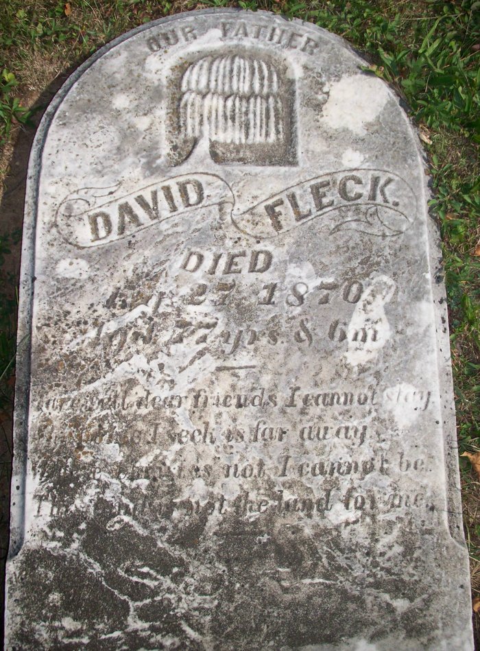David Fleck, age 71, married Keziah Stewart, daughter of Alexander Stewart and Mercy Irwin, on 26 January 1865 at Londonderry Township, Bedford County, Pennsylvania.1,8 David Fleck, age 76 years, appeared as head of household on the census of 1870 at Tyrone Township, Blair County, Pennsylvania.9 According to the Federal Census in 1870, David was a retired farmer.9 He died on 27 August 1870 at Sinking Valley, Blair County, Pennsylvania, at age 77.1,2,3,4 He was buried on 7 September 1870 at Saint Johns Lutheran Cemetery, Tyrone Township, Blair County, Pennsylvania.3